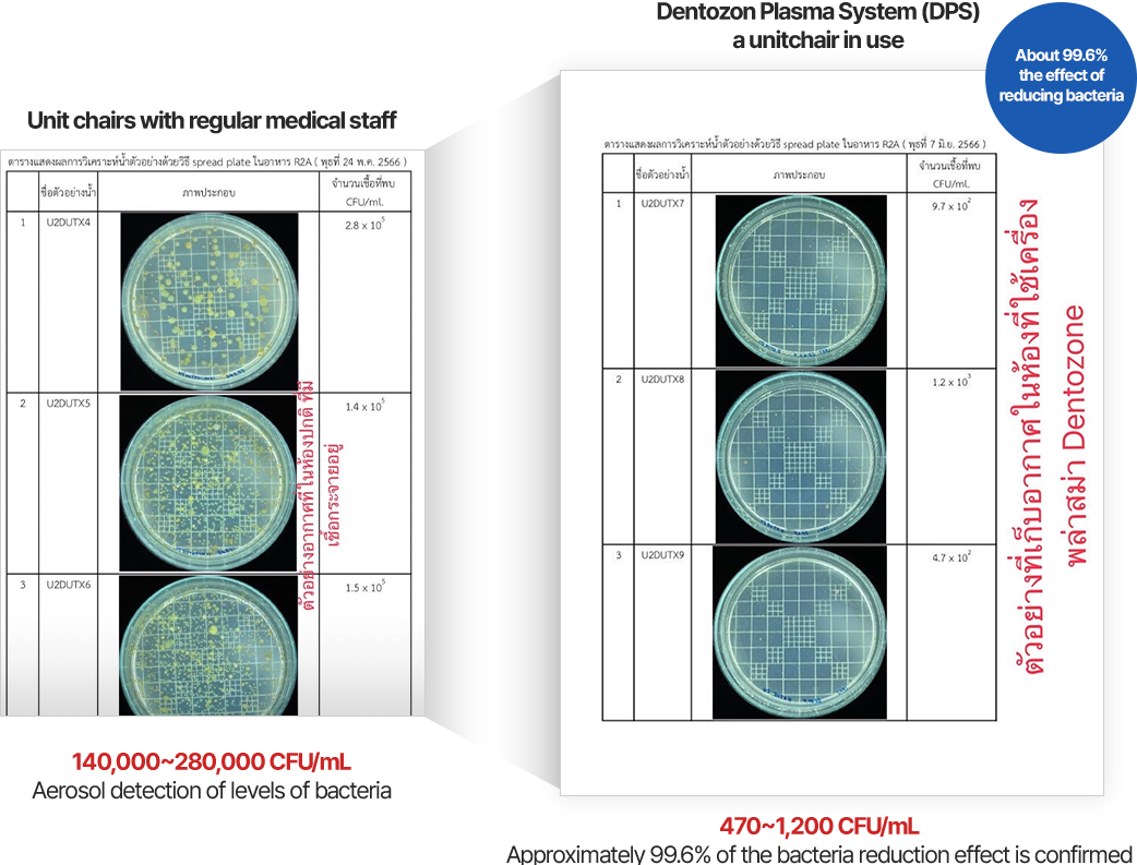 In 2023, Chulalongkorn University, Thailand’s top national university, conducted a highly significant and insightful study involving dentists and dental hygienists. The focus of this research was the bacterial content in aerosols generated from dental unit chairs — comparing units that used ordinary treatment water with those equipped with the DENTOZONE Plasma Dental Water System (DPS2). The results were remarkable.
