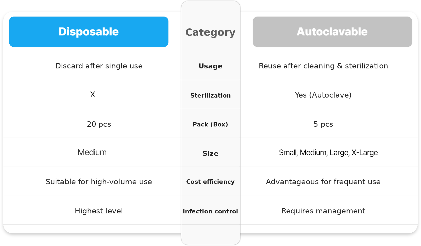 The product is available in two models: Single-use and Reusable (Autoclavable).